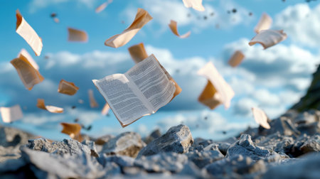 An artistic representation of an open book floating above a rocky landscape, surrounded by pages in motion, symbolizing inspiration and the freedom of imagination.