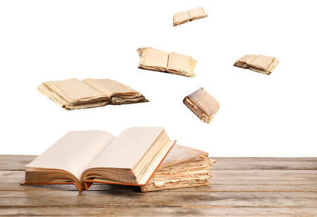 Flying old books on white background