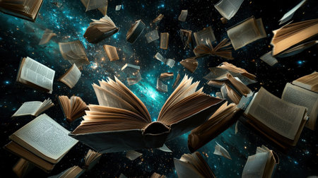 A creative representation of knowledge as a galaxy of glowing books and letters swirling in space