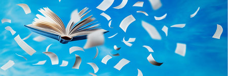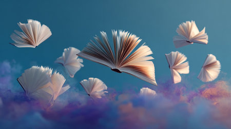 Open Book Flying Through the Sky, Spreading Knowledge and Imagination with Every Page Turn