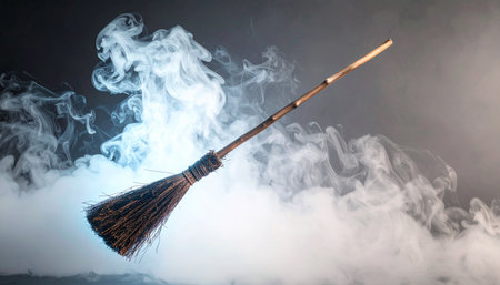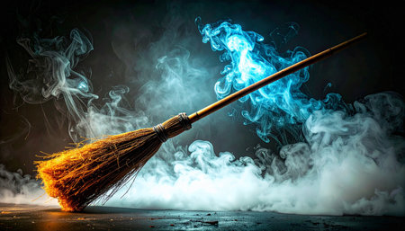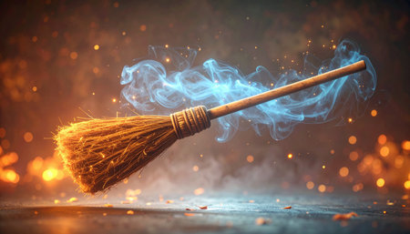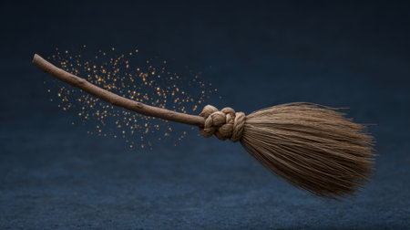 This enchanting image showcases a rustic broomstick adorned with sparkling particles, evoking a sense of magic and whimsy against a dark backdrop, perfect for capturing imagination and fantasy themes.