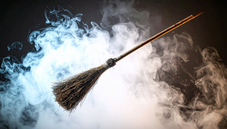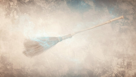 A traditional broom is captured in action as it sweeps dust and debris into the air, creating a dynamic and visually striking image perfect for cleaning themes.