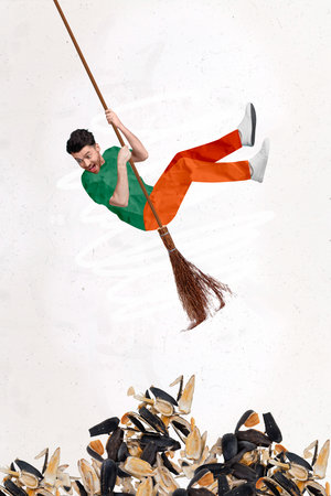 Vertical image sketch collage picture of cheerful excited guy falling down impressed mess sunflower seeds isolated on painted background