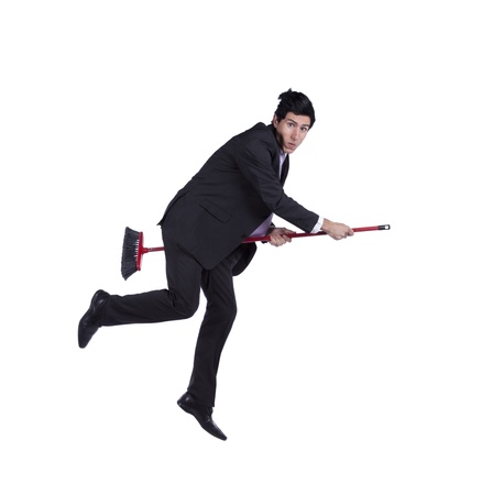 Scary young businessman flying a broom (isolated on white)