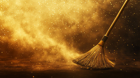 Broom sweeping up gold dust and glitter on dark background