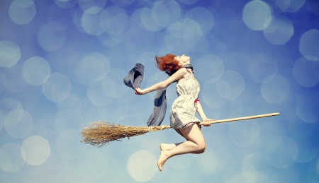 Young red-haired witch on broom flying in the sky. Photo with bokeh at background.
