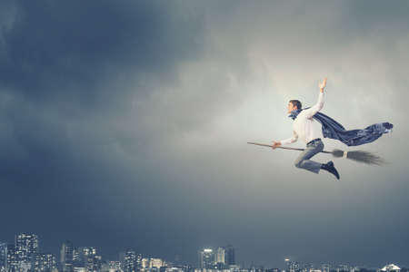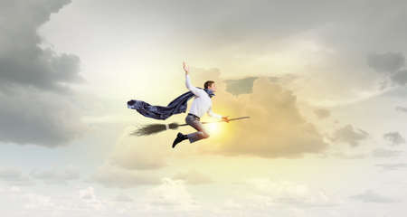 Young businessman flying on broom high in sky