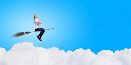 Young girl in casual flying on broom high in sky