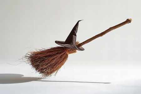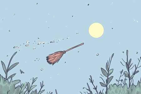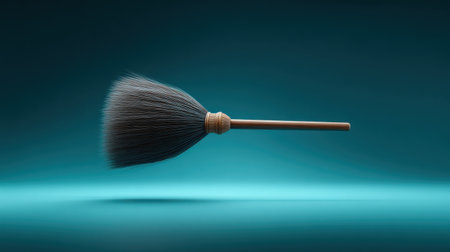 A broomstick is shown in the air with a brush attached to it. The brush is made of bristles and the broomstick is made of wood. The image has a whimsical and playful mood