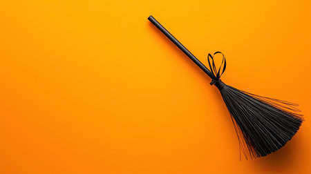 Minimalist Halloween design featuring a black broomstick on a bold orange backdrop, creating a clean, spooky aesthetic