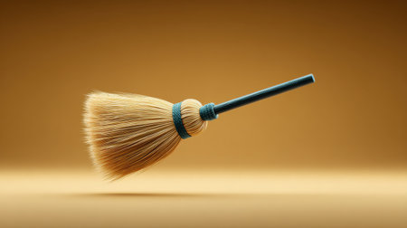This image features a rustic straw broom laid on a warm golden background, enhancing the simplicity and texture of the scene with soft shadow effects.