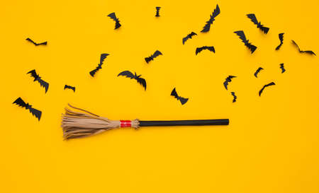 Witch's broomstick, flying bats on yellow background. Halloween handmade decor. top view. flat lay
