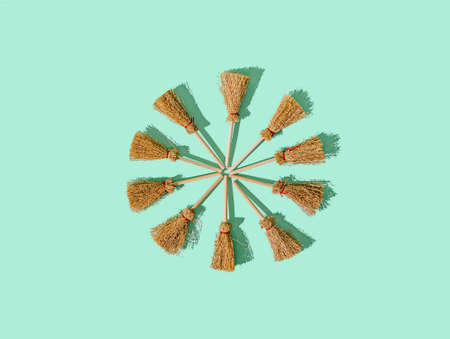 Ten brooms neatly aligned in cercle on a lime green background. Halloween witches brooms artistic design. Sorcery tricks party invitation creative concept.