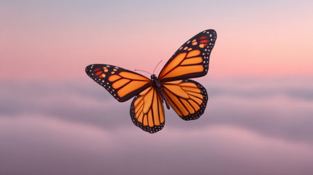A stunning monarch butterfly gracefully flies through a soft pastel sky at sunrise, surrounded by wispy clouds, showcasing its vivid orange wings.