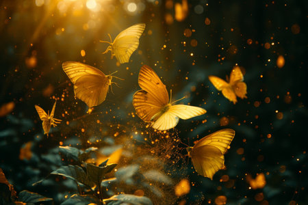 Enchanting fireflies and radiant butterflies dance in a magical summer garden scene