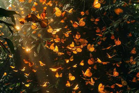 A stunning display of colorful monarch butterflies gracefully fluttering among lush green foliage, surrounded by a vibrant paradise of nature.