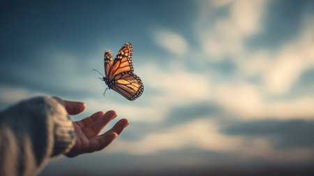 Delicate butterfly gracefully takes flight from outstretched hand, symbolizing freedom and transformation against serene sky. soft clouds create tranquil backdrop, enhancing moment beauty