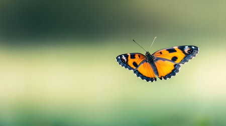 AI-generated A colorful butterfly with orange and yellow wings takes flight. The soft green background creates a serene and natural atmosphere.