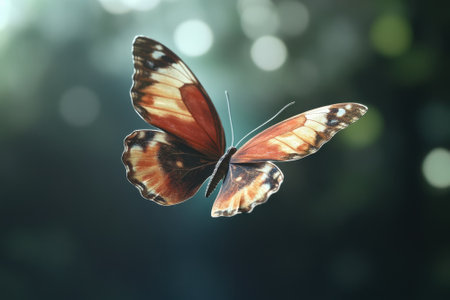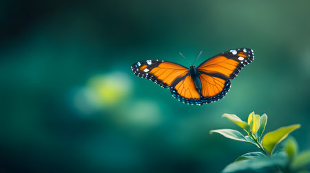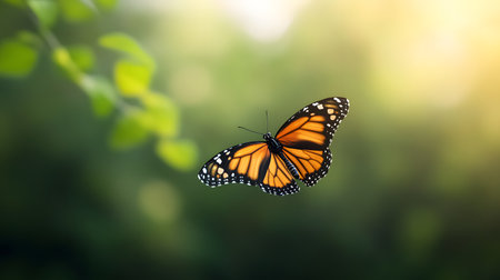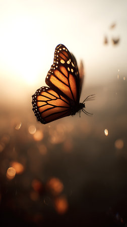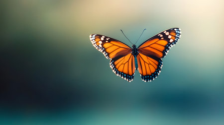 AI-generated A monarch butterfly hovers in the air, showcasing its intricate wing patterns. The diffused light casts a gentle glow, emphasizing its delicate beauty.