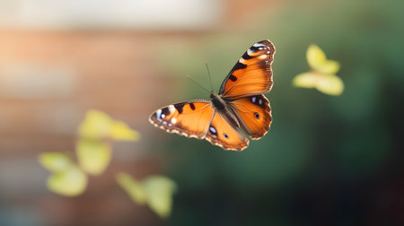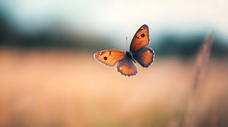 AI-generated An orange butterfly gracefully flies against a soft, warmtoned background, showcasing its wings in midair. The image evokes a sense of freedom and gentle movement.