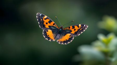 An orange butterfly with black spots gracefully flies through a soft green garden. The image captures a moment of freedom and the gentle movement of nature.
