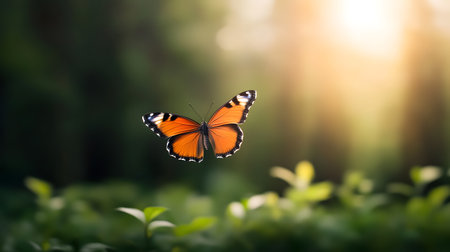 AI-generated A vibrant orange butterfly gracefully flies through a sunlit forest. The soft bokeh background creates a magical and peaceful atmosphere.