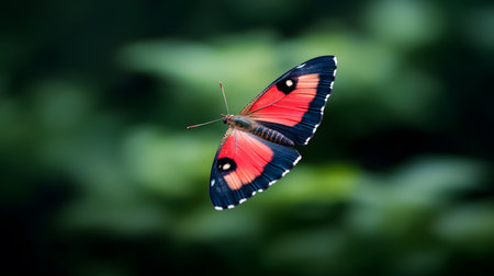 AI-generated A striking red butterfly with black and white markings takes flight against a blurred green backdrop.