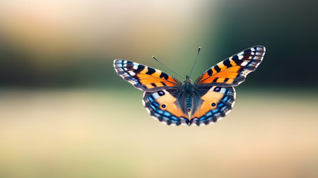 AI-generated A vibrant painted lady butterfly displays its intricate wing patterns in a closeup shot. The soft, blurred background creates a sense of delicate beauty.