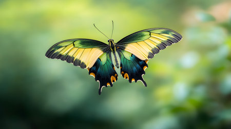 AI-generated A stunning butterfly with yellow, green, and blue wings is captured midflight against a soft, blurred background.
