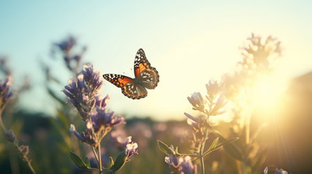 AI-generated A solitary orange butterfly gracefully flies through a sunlit field with a soft, blurred background. The image evokes a sense of freedom and peaceful movement.