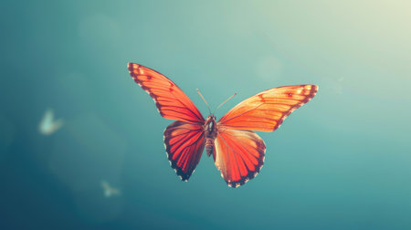 Capture the stunning elegance of a vibrant red butterfly gracefully soaring through a clear blue sky, symbolizing freedom and the beauty of nature.