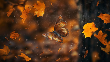 A mesmerizing butterfly amidst falling autumn leaves. Golden hues and soft focus create a dreamy ambiance.