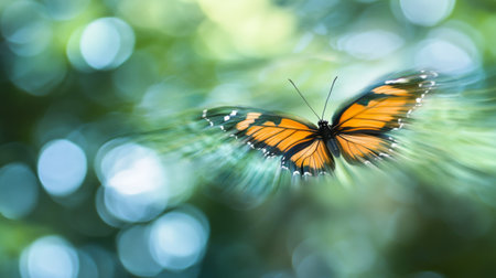 AI-generated A vibrant monarch butterfly takes flight with its wings spread wide. The soft bokeh background creates a dreamy and serene atmosphere.