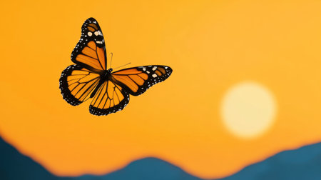 A single Monarch butterfly is captured in graceful mid-flight against the serene backdrop of a golden sunset over hazy mountains. This beautiful and peaceful image evokes feelings of freedom, hope, transformation, and the tranquility of nature.