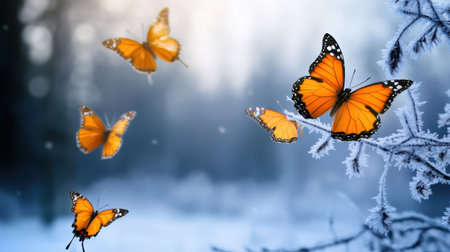 Mystical scene of butterflies glowing in a quiet, frost-covered forest
