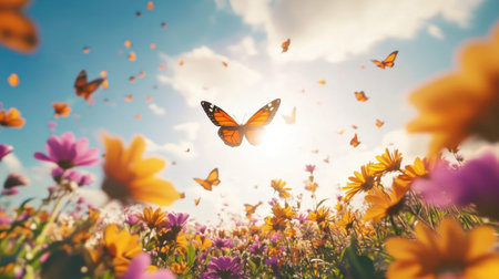A stunning display of butterflies fluttering among colorful flowers under a bright blue sky, creating a serene and joyful scene of natural beauty and harmony.
