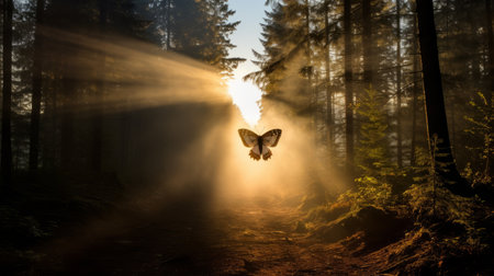 a butterfly gracefully flutters through a misty boreal forest at dawn, as soft rays of sunlight create an ethereal atmosphere. in the distance, a powerful digital marketing presence illuminates the path ahead, blending harmoniously with the beauty of nature. this captivating photo captures the awe-inspiring combination of butterfly and advanced digital marketing in perfect harmony. ai generated