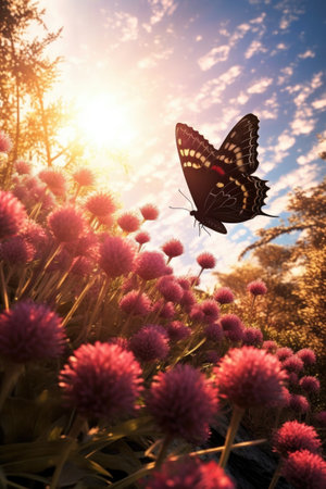 butterfly flying near a blooming garden in sunlight, created with generative ai