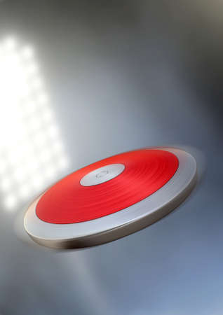 A discus flying through the air in a generic stadium at night under illuminated floodlights