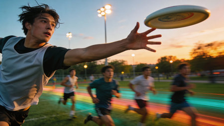 Athletic young man in sportswear reaches out to catch a flying disc during an outdoor game on a grassy field at sunset. Dynamic action and team competition captured with motion blur.