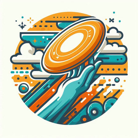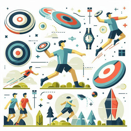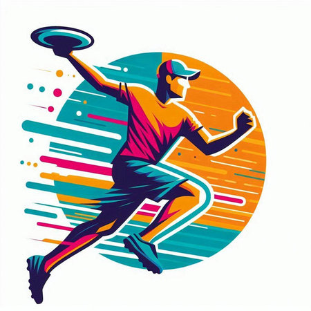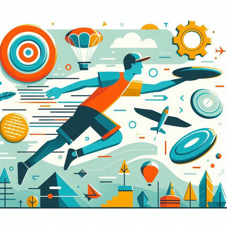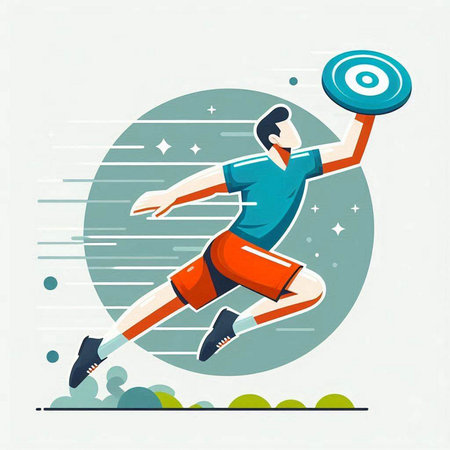 Illustration of a man throwing a disc in the air. Flat design.