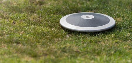 Close up of discuses on grass after impact on grass