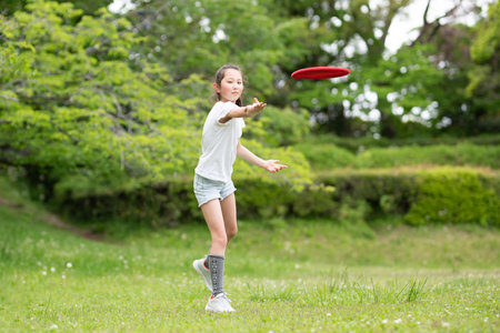 Japanese student girl playing flying disc (6 years old)