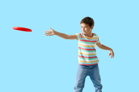 Funny little boy playing flying disc on color background