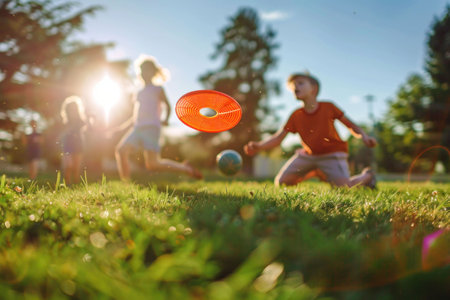 Children playing with a frisbee in a sunlit park, surrounded by green grass and trees A joyful moment captured in a warm, golden light