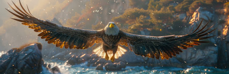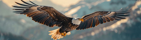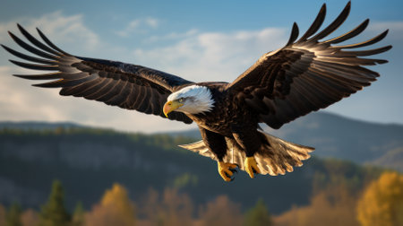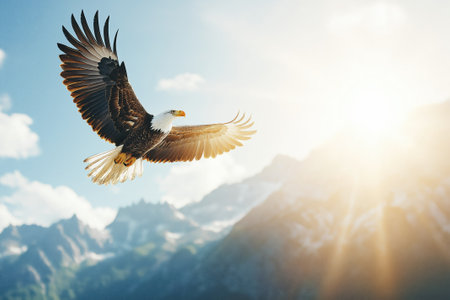 A majestic bald eagle flies over a mountain backdrop, showcasing its impressive wingspan in a stunning scene