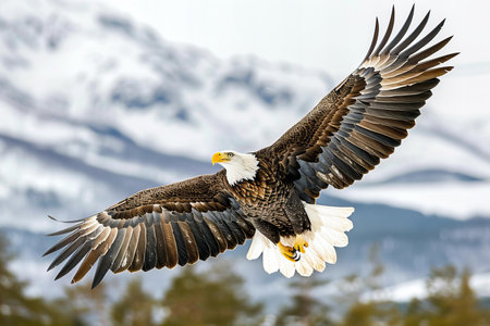A majestic eagle is soaring through the sky above a snow-covered mountain range. Concept of freedom and power, as the eagle effortlessly glides through the air
