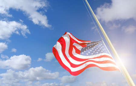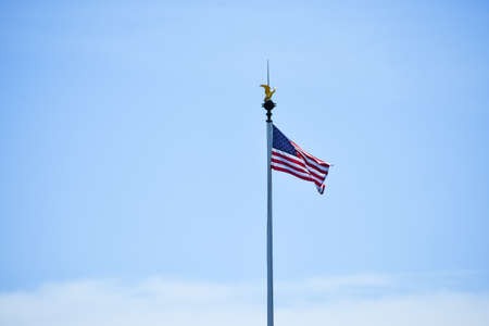 American flag raising with sky background United States National patriotic concept for independence day and 4th July holiday celebration. National historic landmark. Patriotic concept