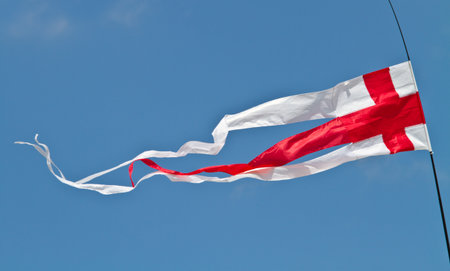 The English flag, the red cross of St George, flying as a pennant against a blue sky on a sunny day