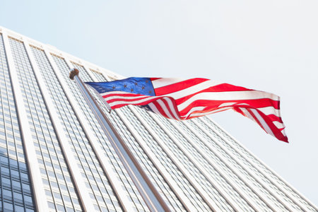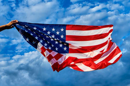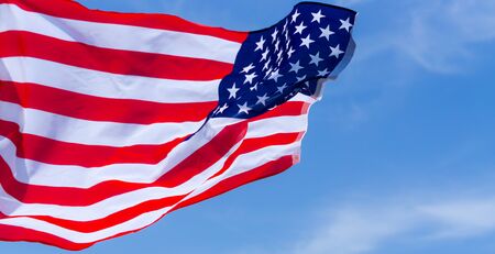 The national flag of the United States of America waving in the wind. Clear sky in the background. Selective focus. Democracy, independence and election day. Patriotic symbol of American pride